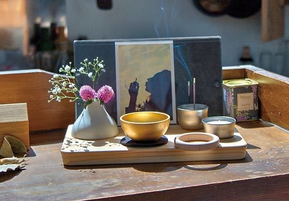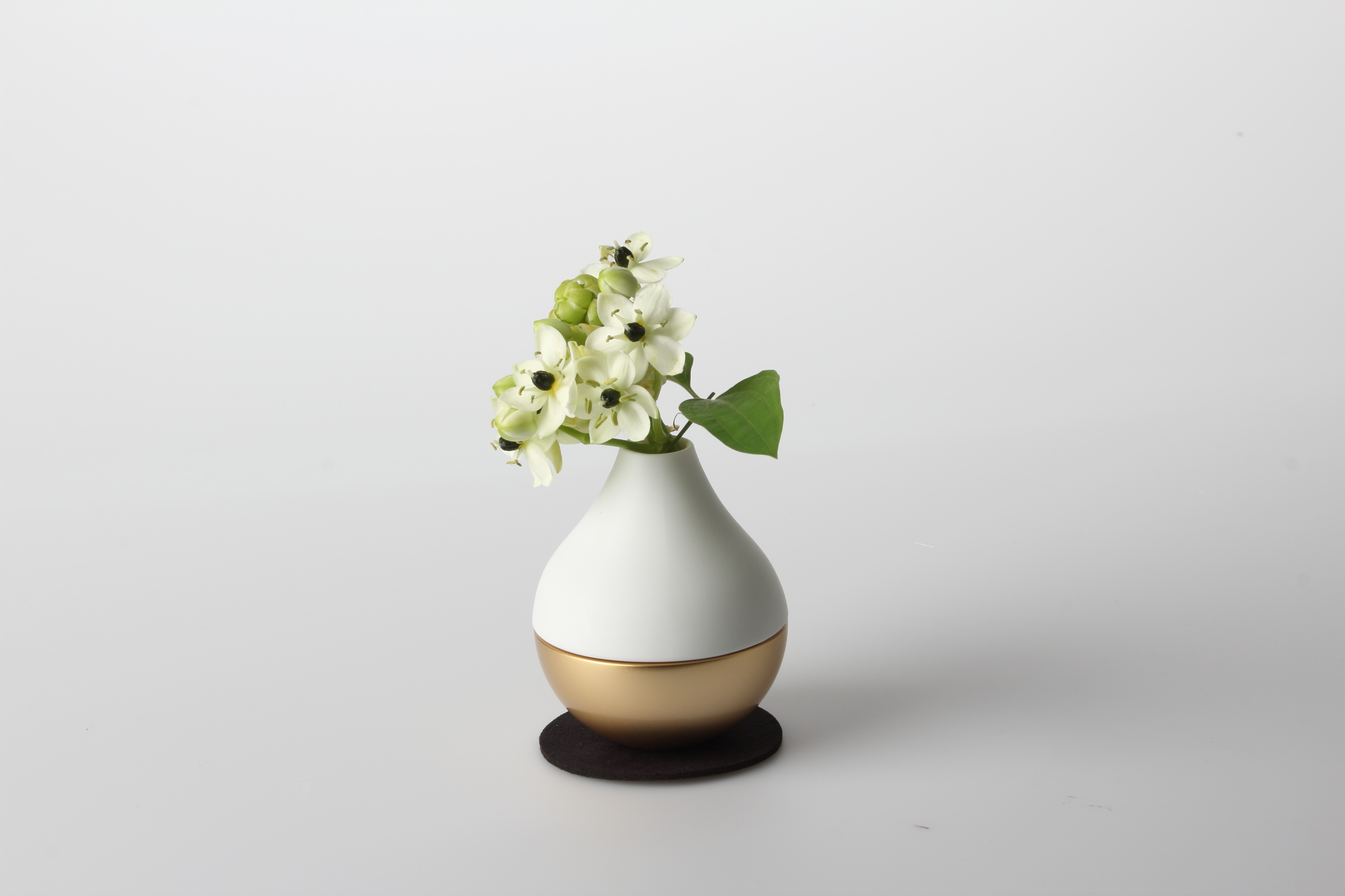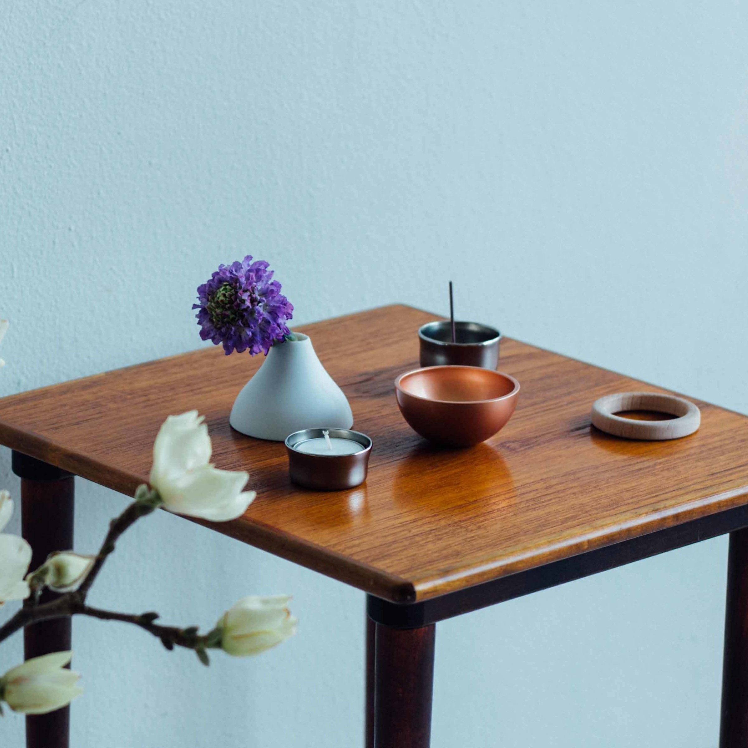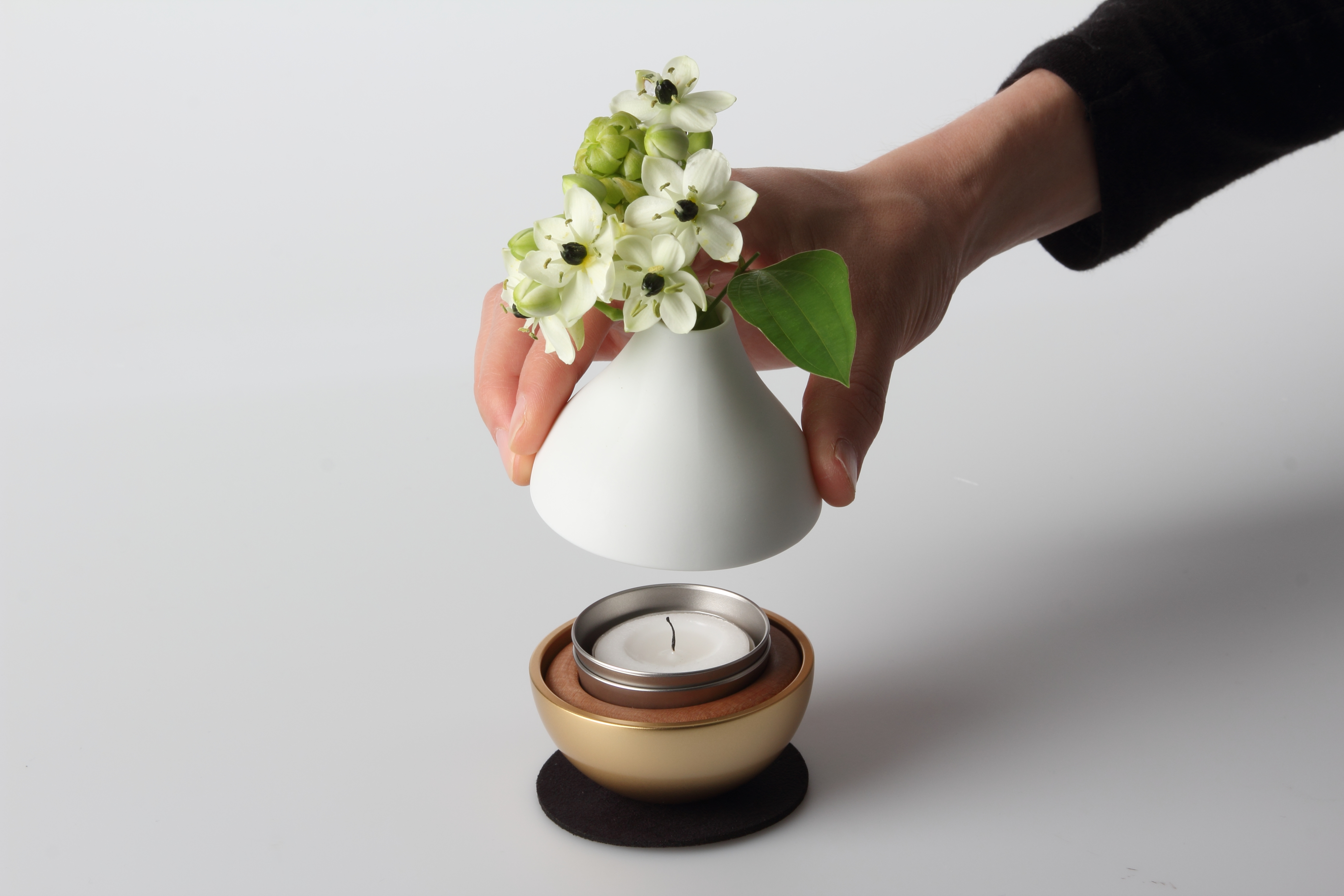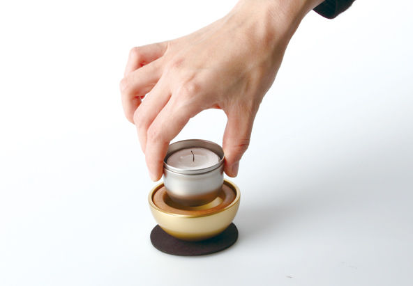 しずく型の本体の中に、「三具足」(火立、香立、花立)がすべておさめられており、台座部分はそのままおりんの役割を担います。普段は写真立ての前に花立としてさりげなく据えておくことができ、必要があれば、さっと本格的に祈りの場をしつらえることが可能です。