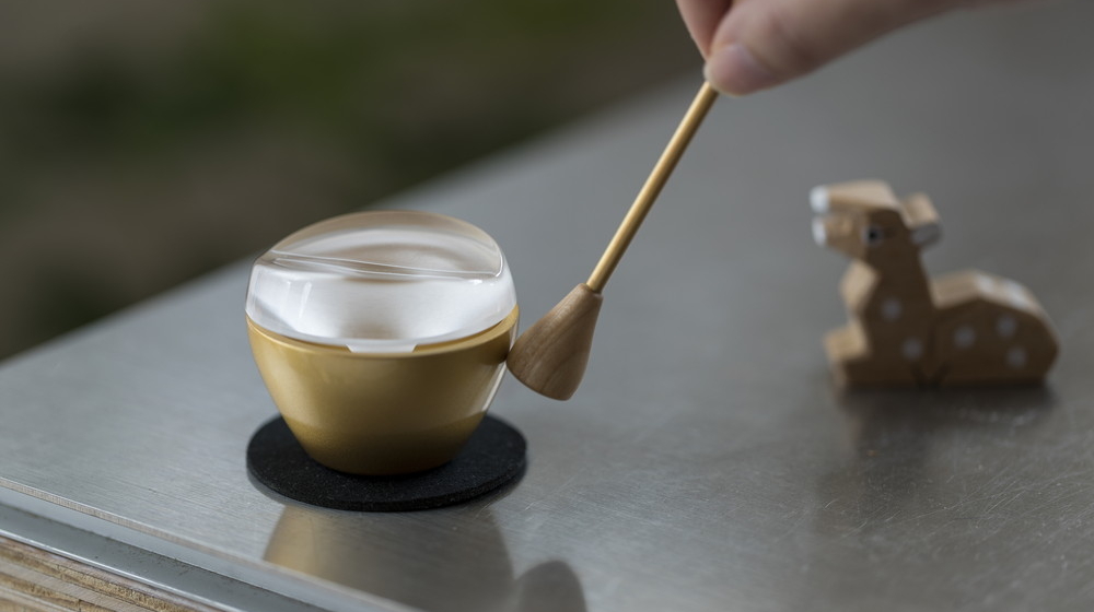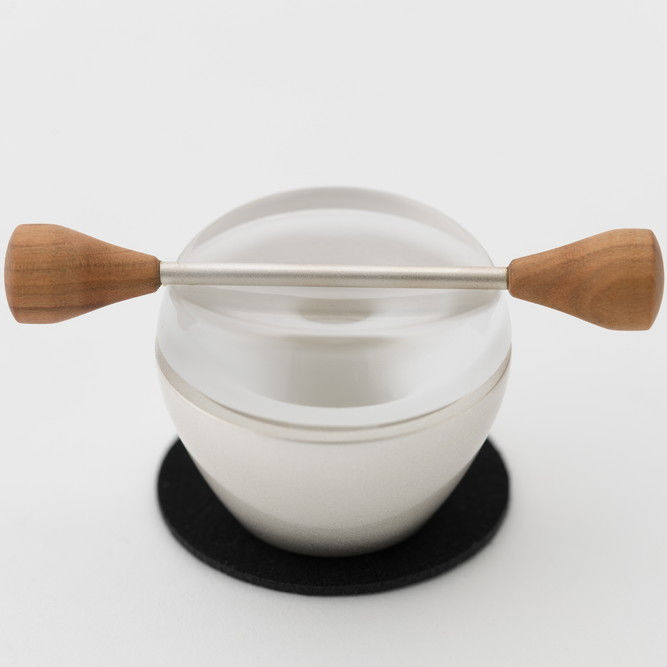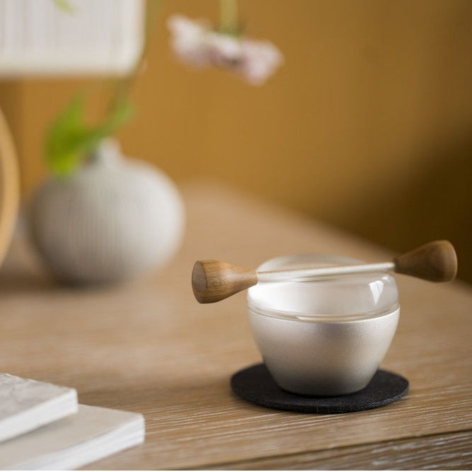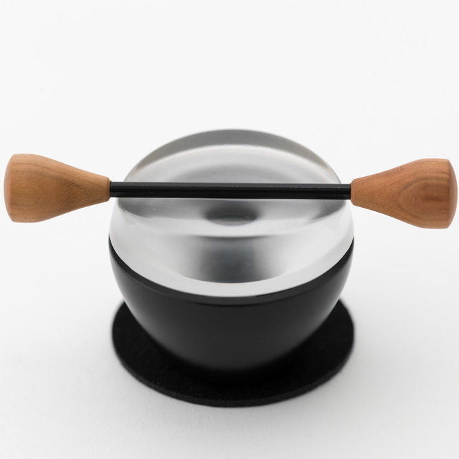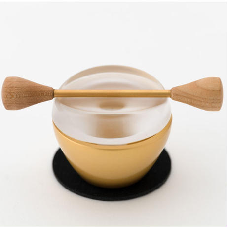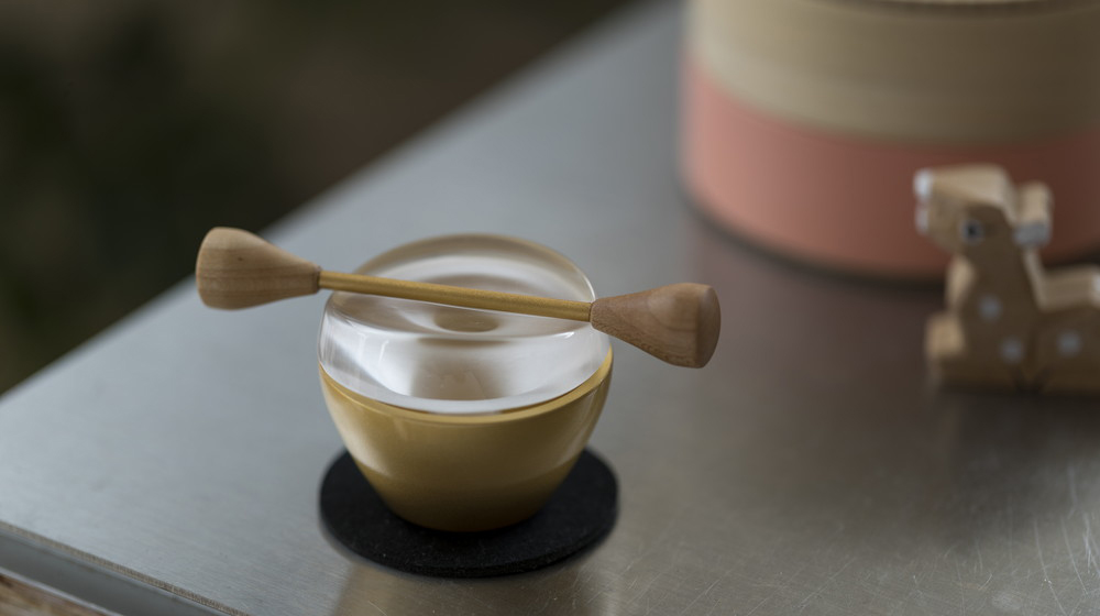 おりん上部のガラスで作られた置台にさり気なく置かれたリン棒が印象的な「Paddle」。その名の由来となったパドルのような形のリン棒でおりんを鳴らし、澄み渡った音色を故人のもとへ届けられます。リン棒と本体の透明感のある佇まいが様々なインテリアスペースに美しく溶け込みます。
