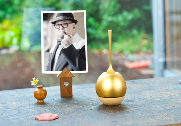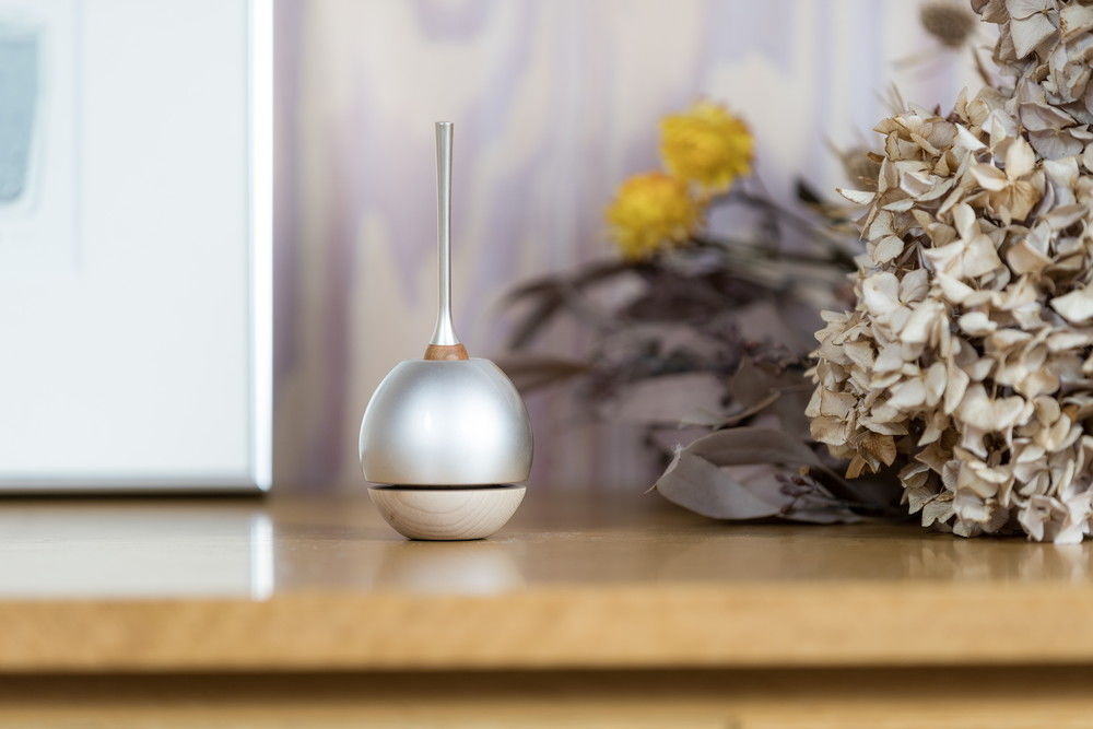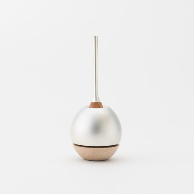 「Cherin wood」は「Cherin」の佇まいはそのままに、下部に天然木を配したおりんです。木のぬくもりが加わることで、素朴さを増したデザインは、リビングや書斎の飾り本棚や、玄関スペースなどにも違和感なく溶け込みます。木製部分がそのまま台座の役割を満たすので、敷布を置く必要もありません。